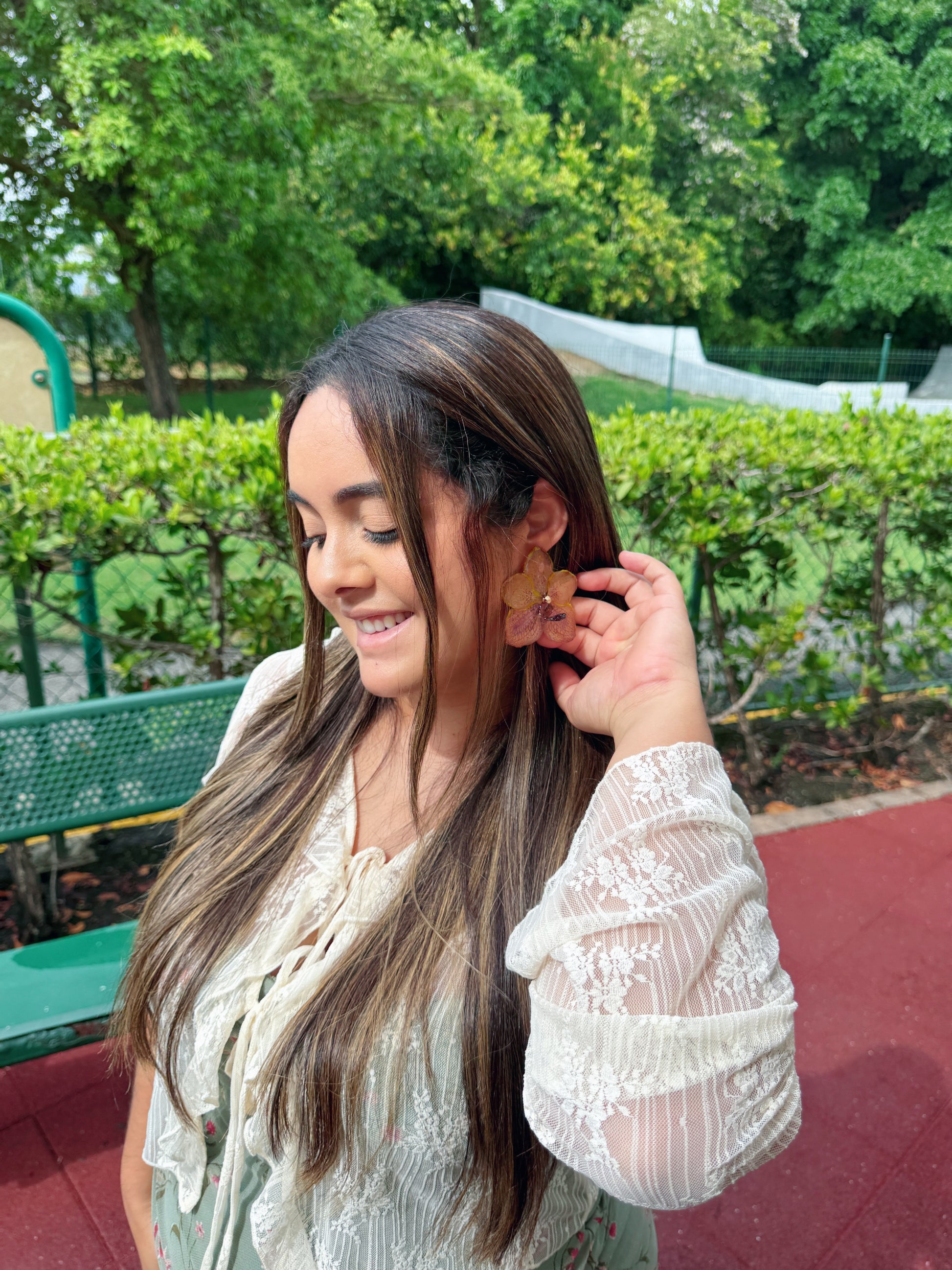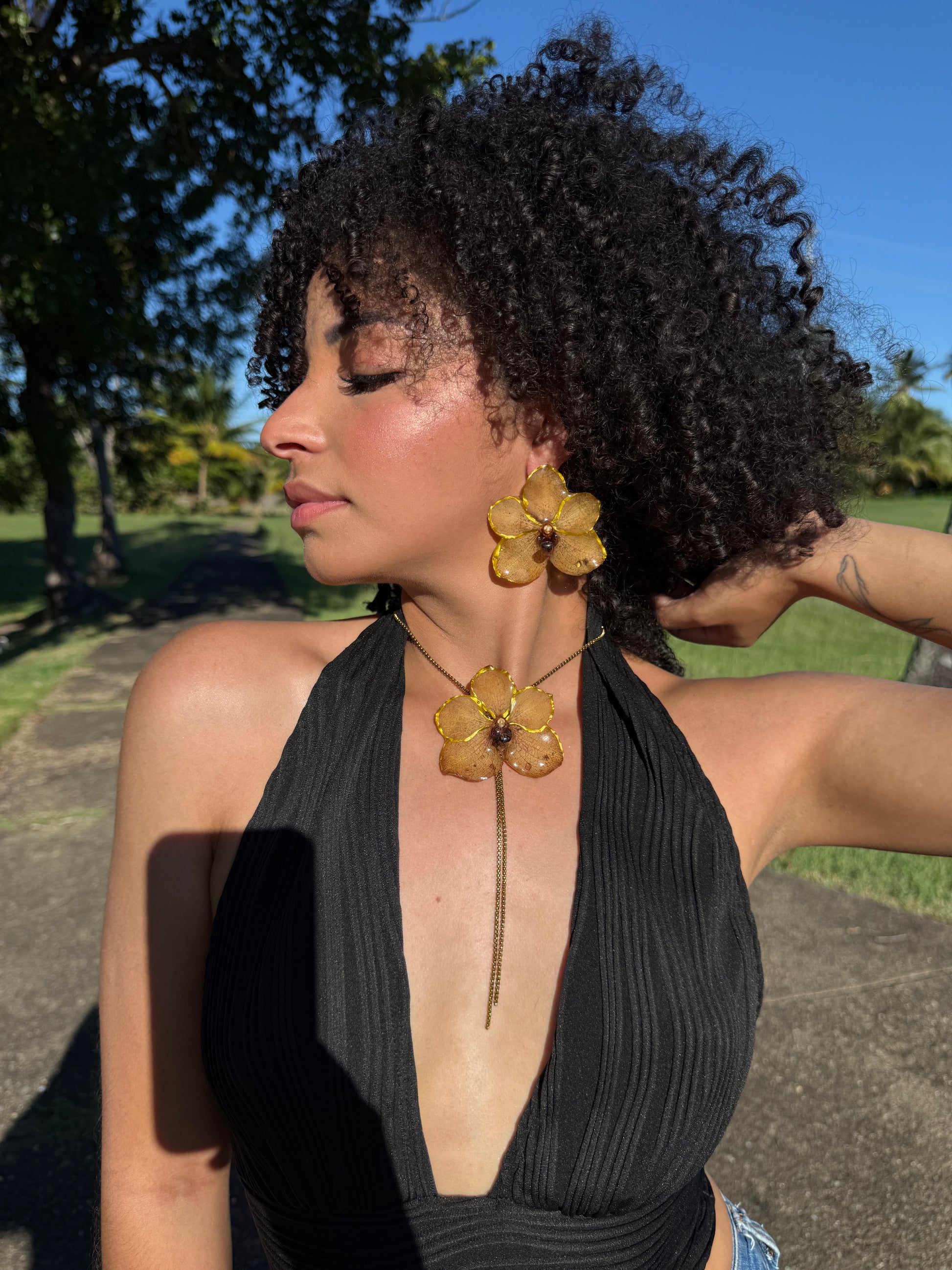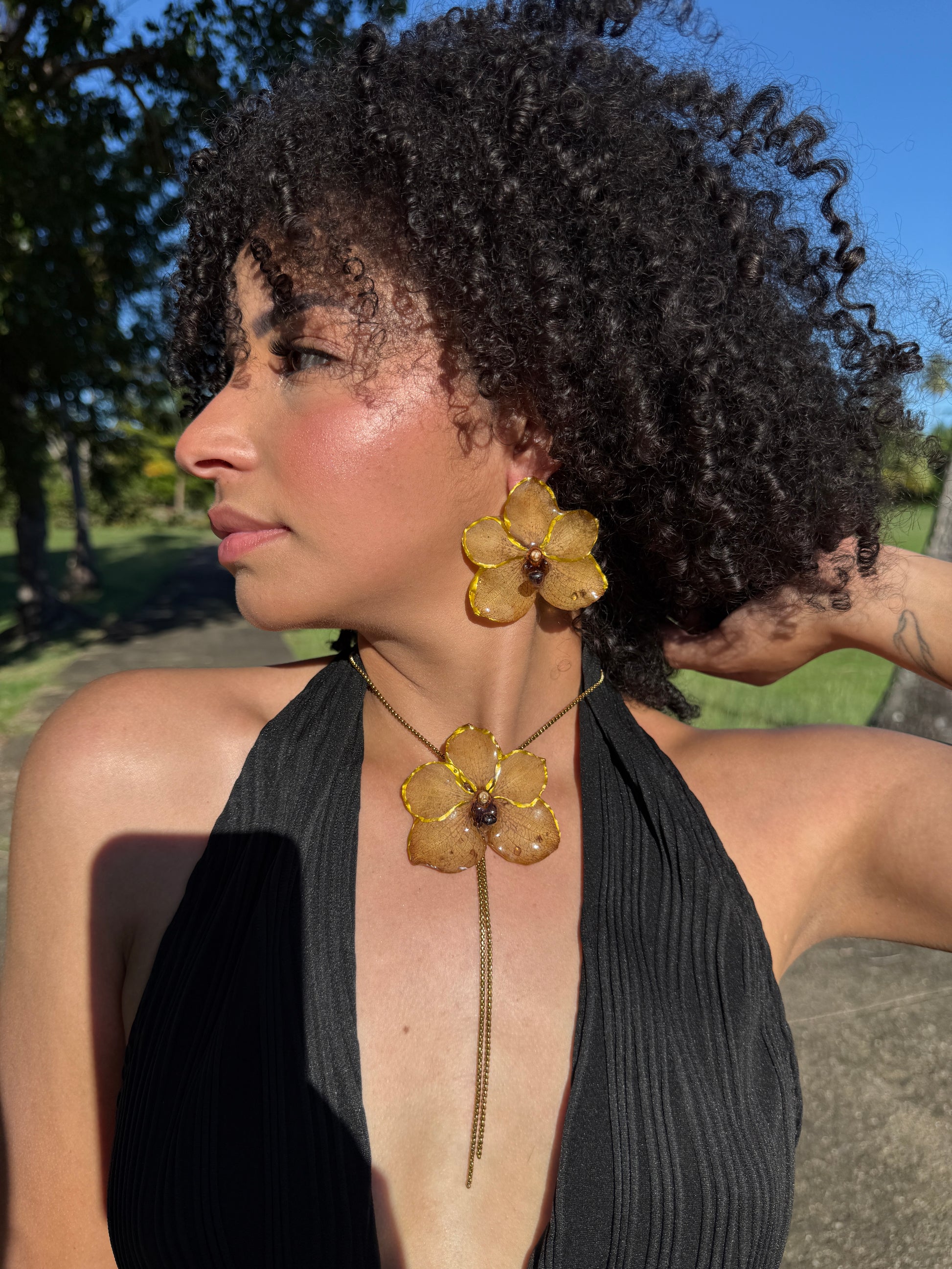 Este set único combina la elegancia y fuerza de la orquídea Vanda en un intenso tono marrón con detalles dorados que resaltan su belleza natural. El collar tipo lazo ajustable y los aretes a juego crean una combinación sofisticada y atemporal, perfecta para mujeres que buscan destacar con accesorios auténticos.