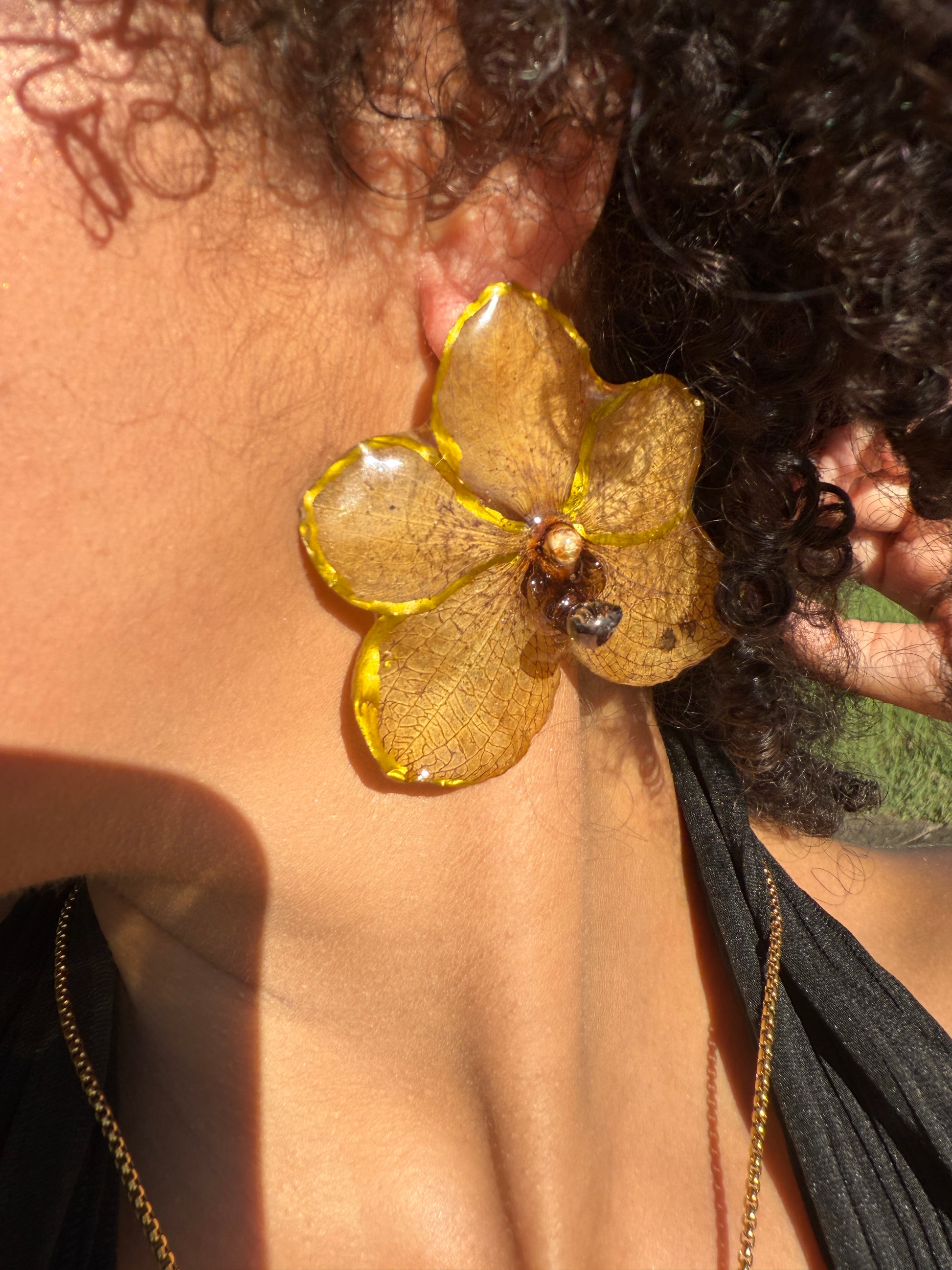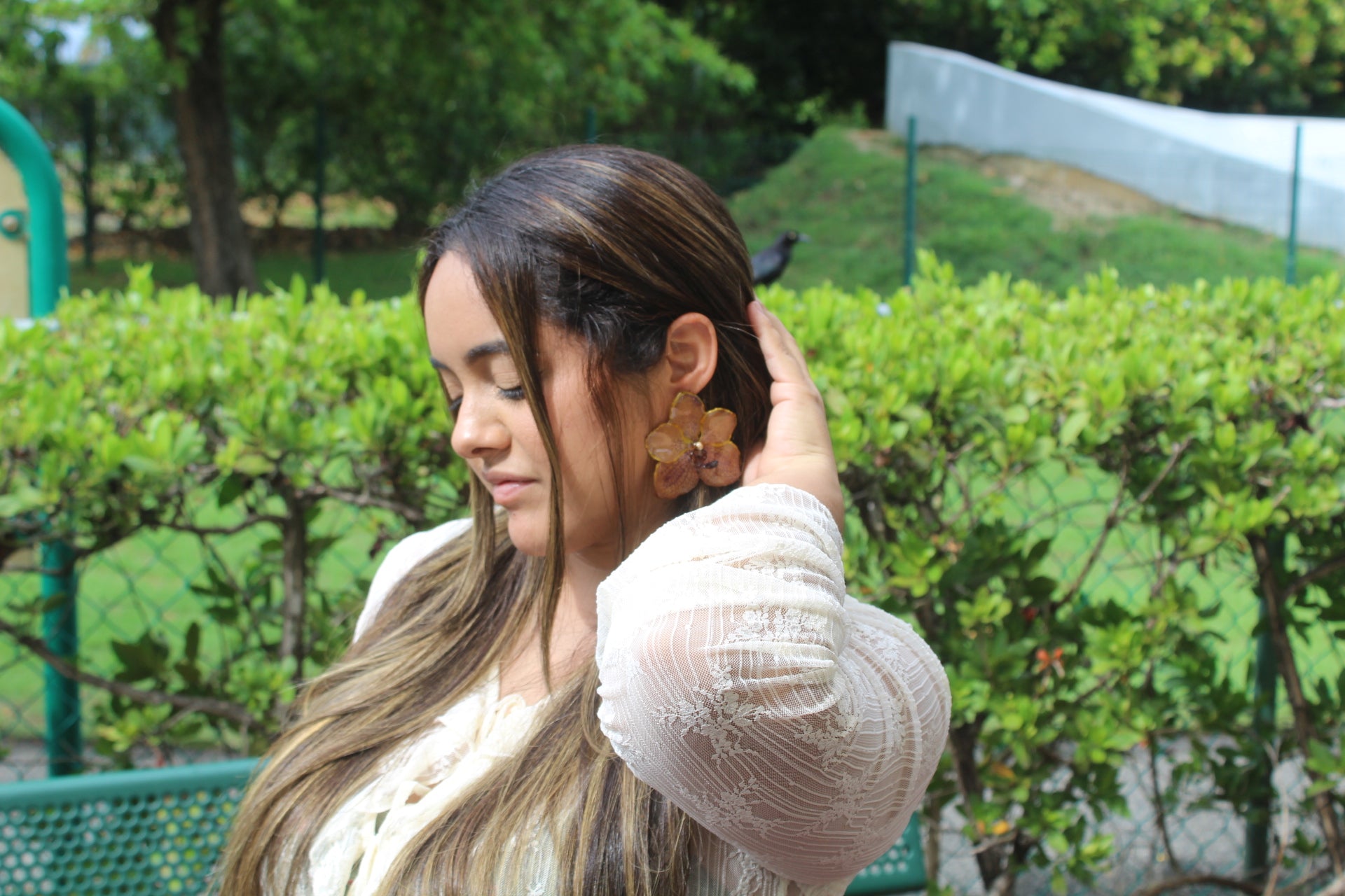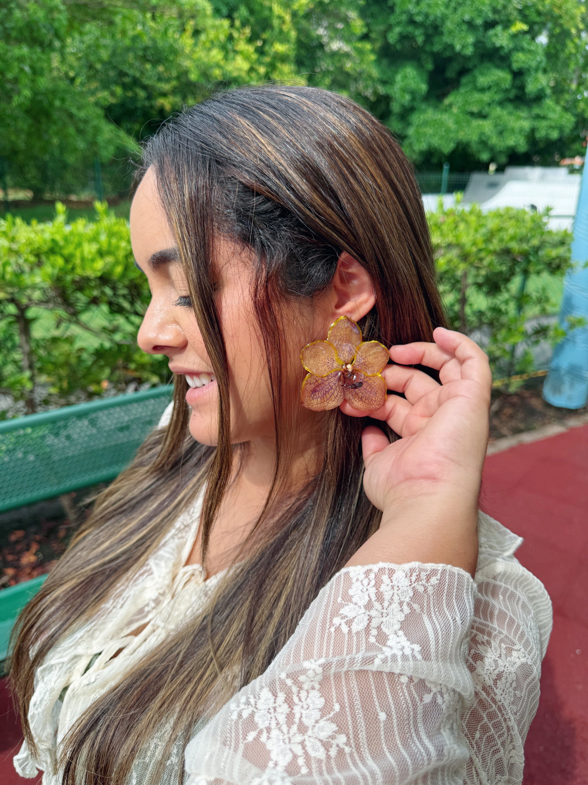 Este set único combina la elegancia y fuerza de la orquídea Vanda en un intenso tono marrón con detalles dorados que resaltan su belleza natural. El collar tipo lazo ajustable y los aretes a juego crean una combinación sofisticada y atemporal, perfecta para mujeres que buscan destacar con accesorios auténticos.