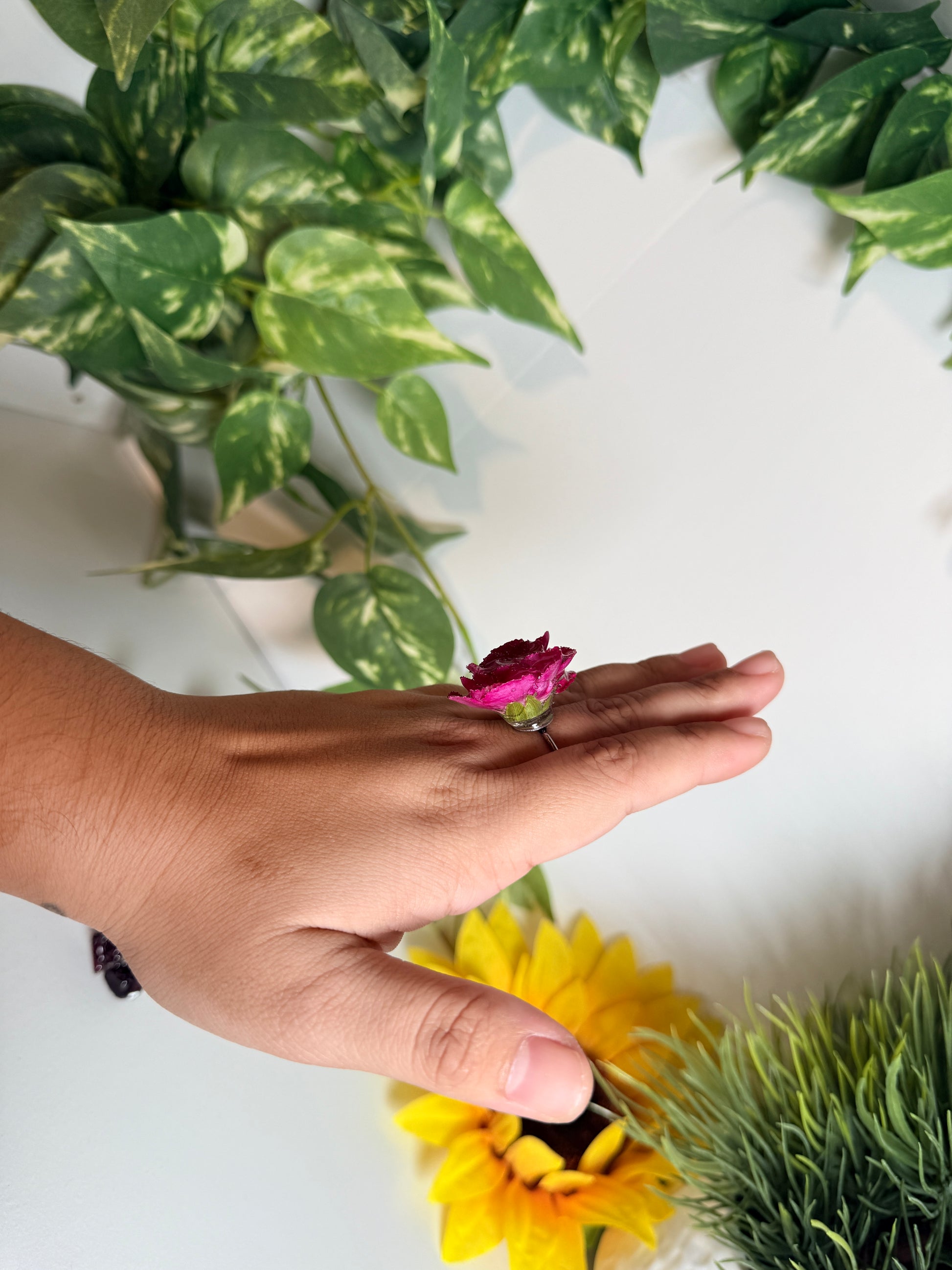 Cada sortija está creada con una flor de clavel mini natural, cuidadosamente preservada para conservar su belleza y esencia. Es una pieza delicada, diferente y llena de significado, pensada para quienes valoran lo auténtico y lo hecho a mano.
