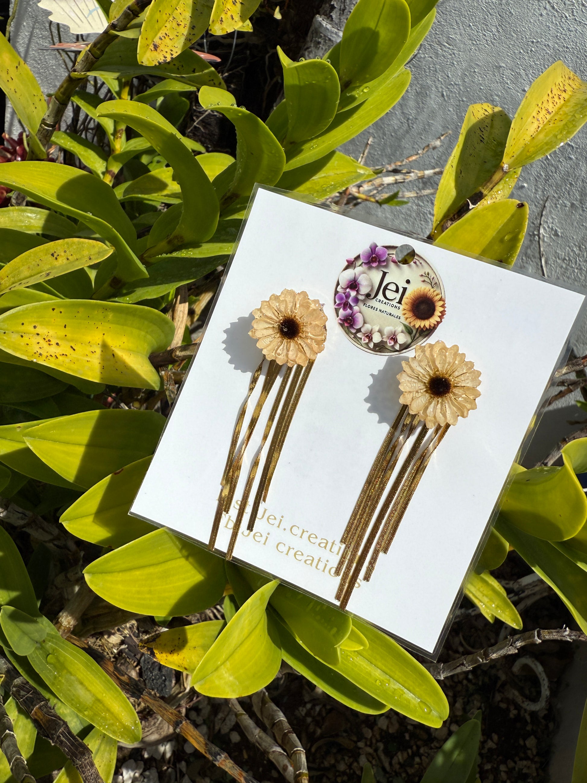 La frescura de una margarita hecha accesorio ✨. Estos aretes están elaborados con flores de margarita natural preservada, cuidadosamente selladas para mantener su forma y color, acompañadas de finas tiras doradas que aportan movimiento, brillo y un toque chic a tu estilo.