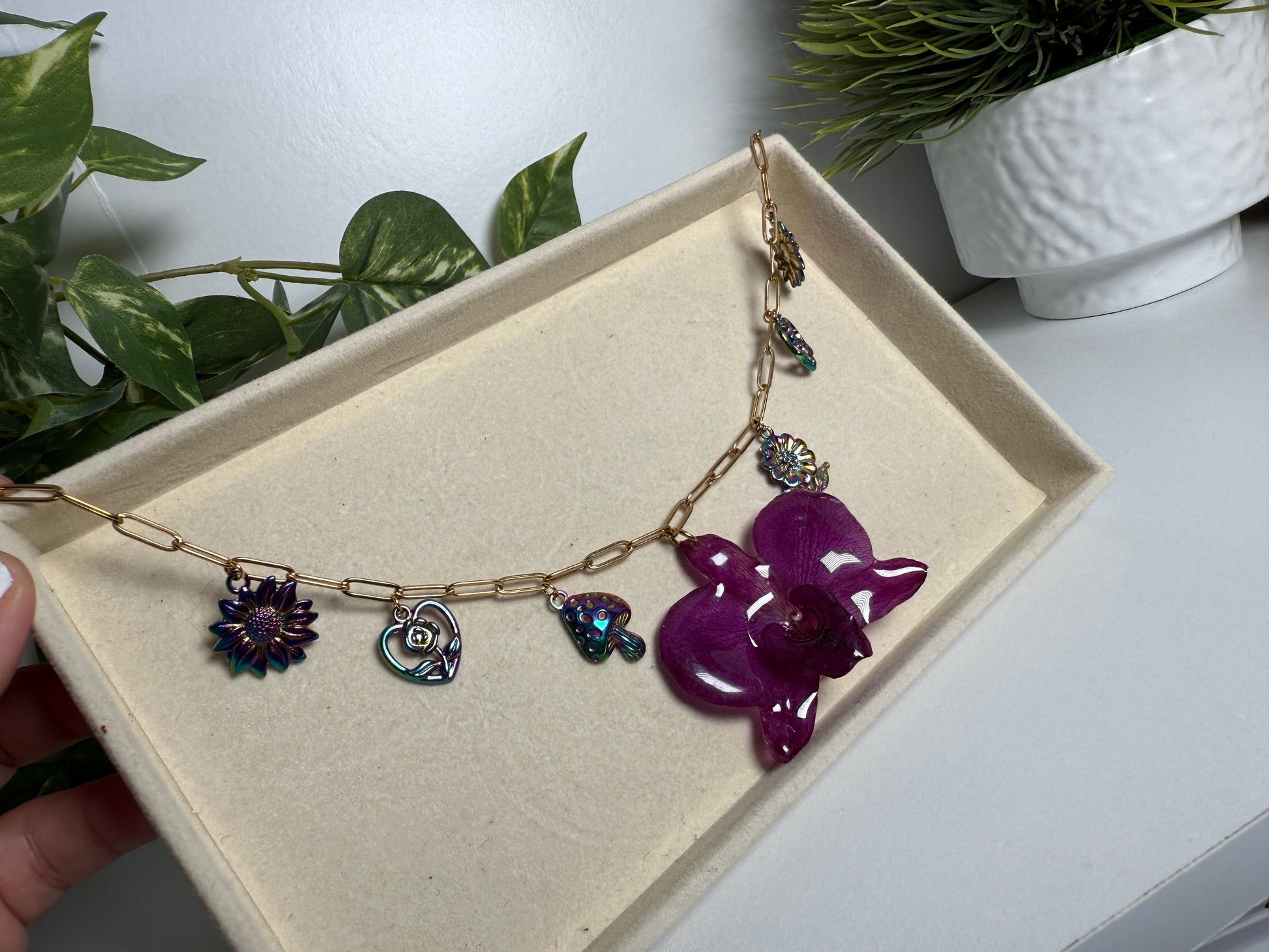 La cadena y los charms son de acero inoxidable, resistentes y duraderos. Su diseño con charms decorativos añade un toque especial y delicado que complementa perfectamente la belleza natural de la orquídea. La cadena es ajustable, permitiéndote llevarla a la altura que prefieras.