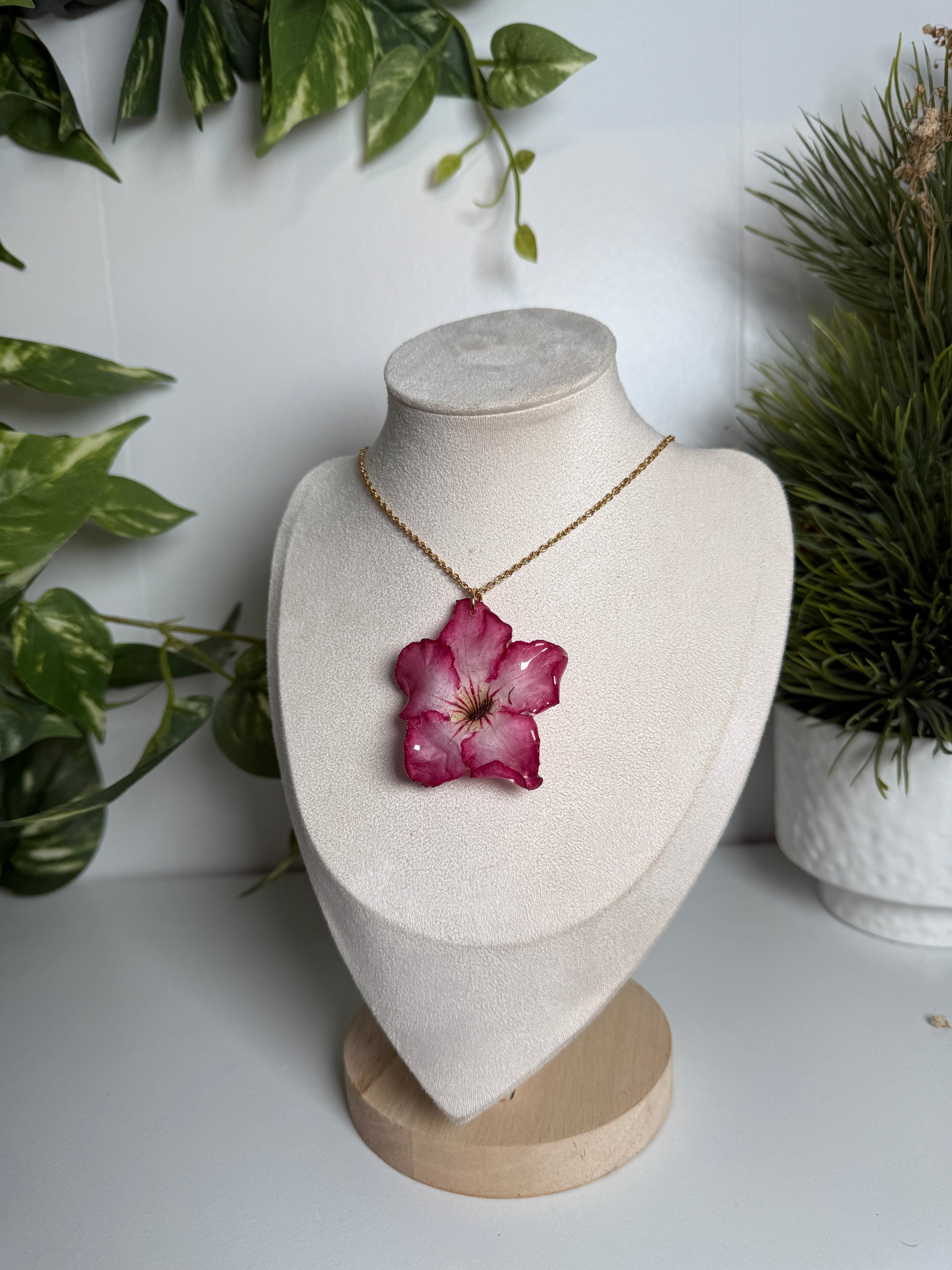 Este collar presenta una Rosa del Desierto (Adenium) real, cuidadosamente preservada y encapsulada, manteniendo la forma orgánica de sus pétalos y los detalles únicos de su centro floral.