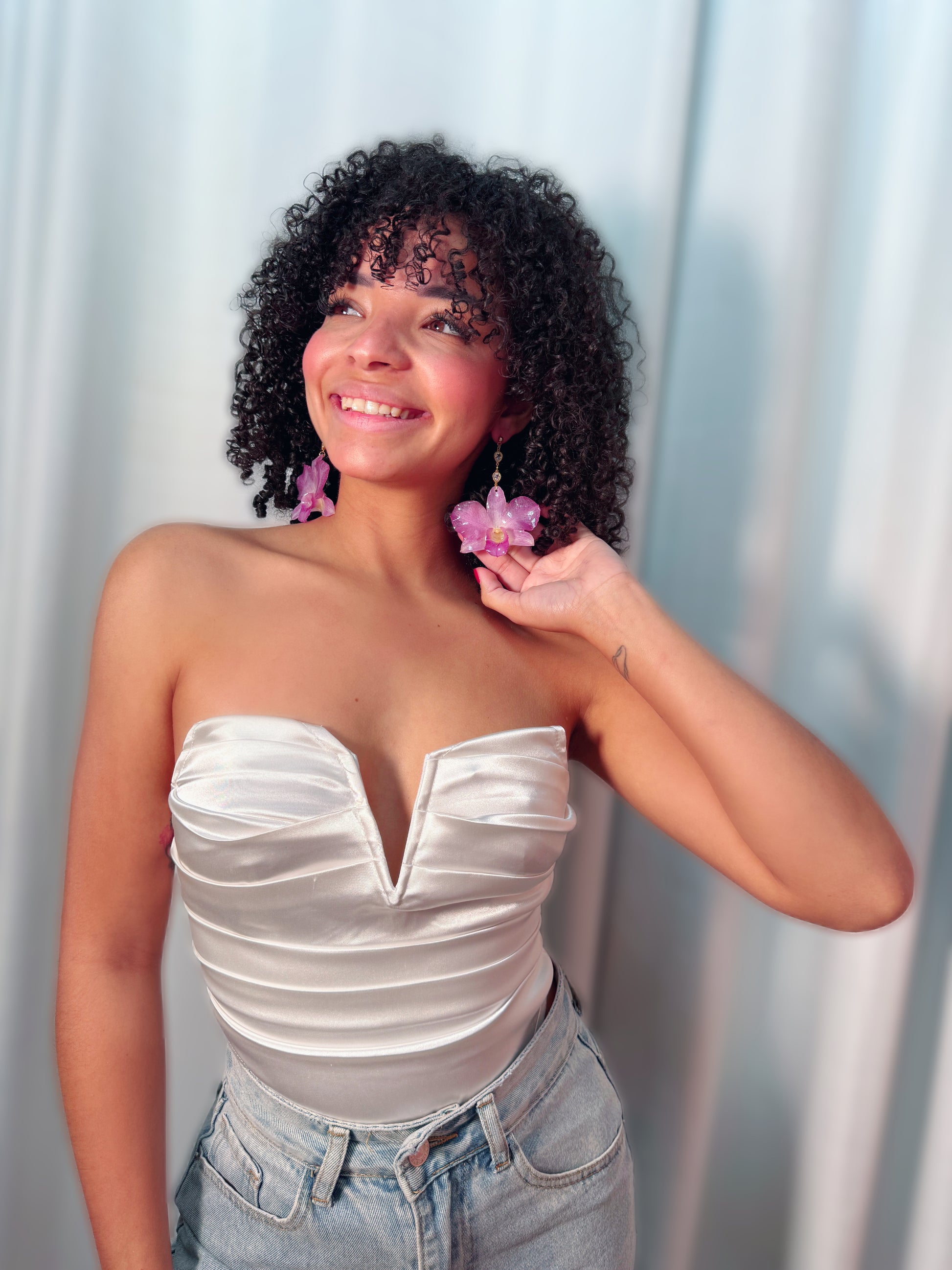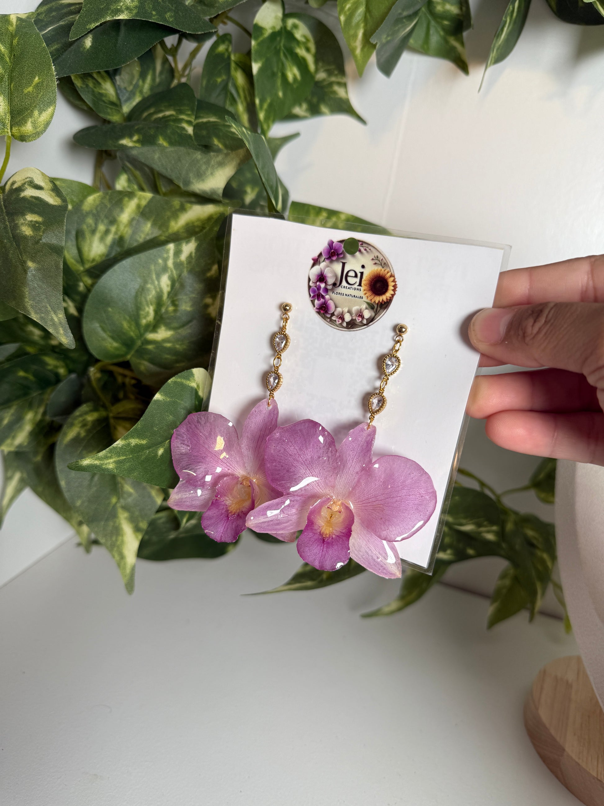 Estos aretes están elaborados con orquídea Dendrobium rosada natural, cuidadosamente preservada y sellada para conservar su forma, textura y color original. Cada flor es real y trabajada a mano, por lo que no existen dos pares iguales.