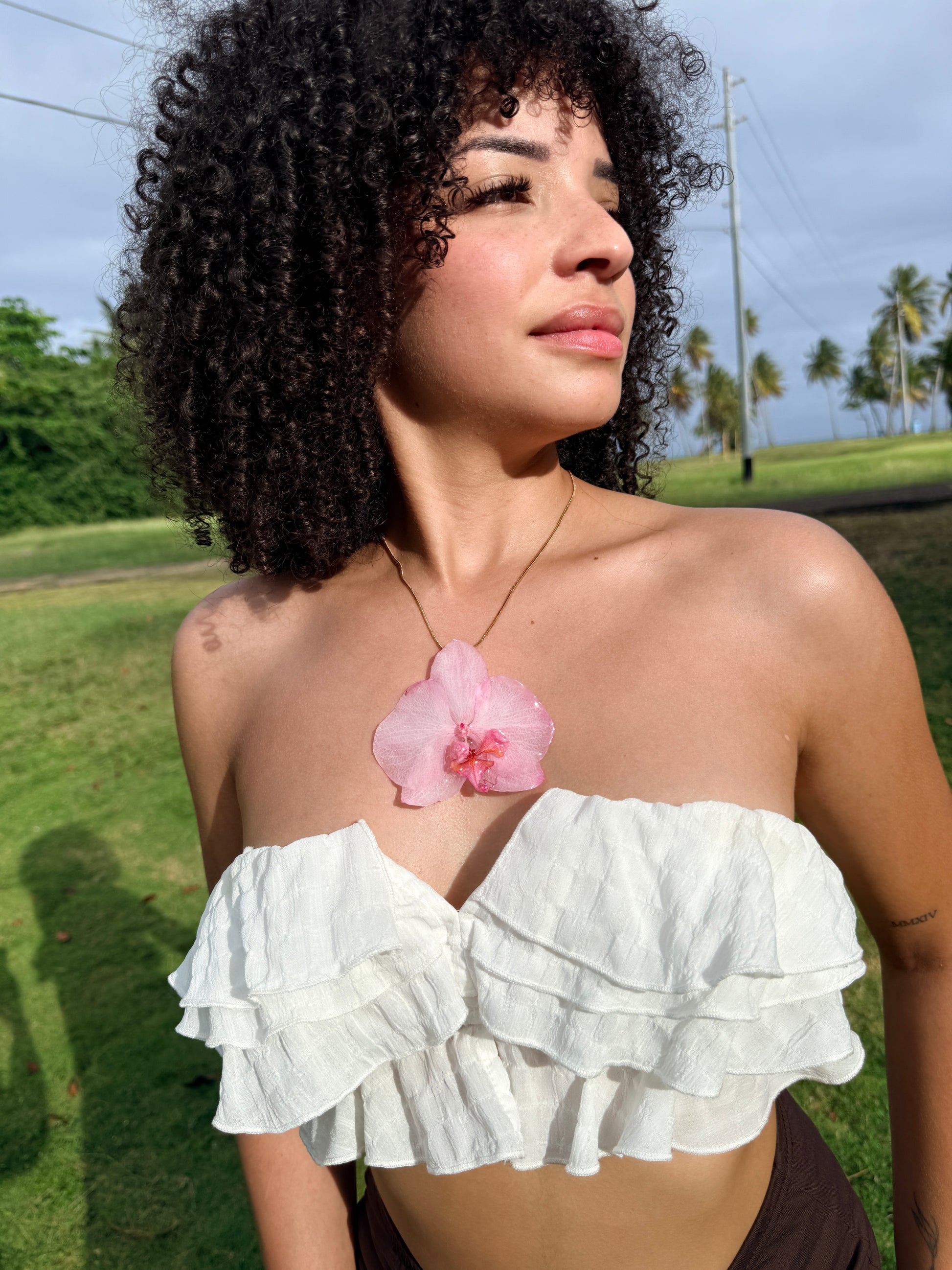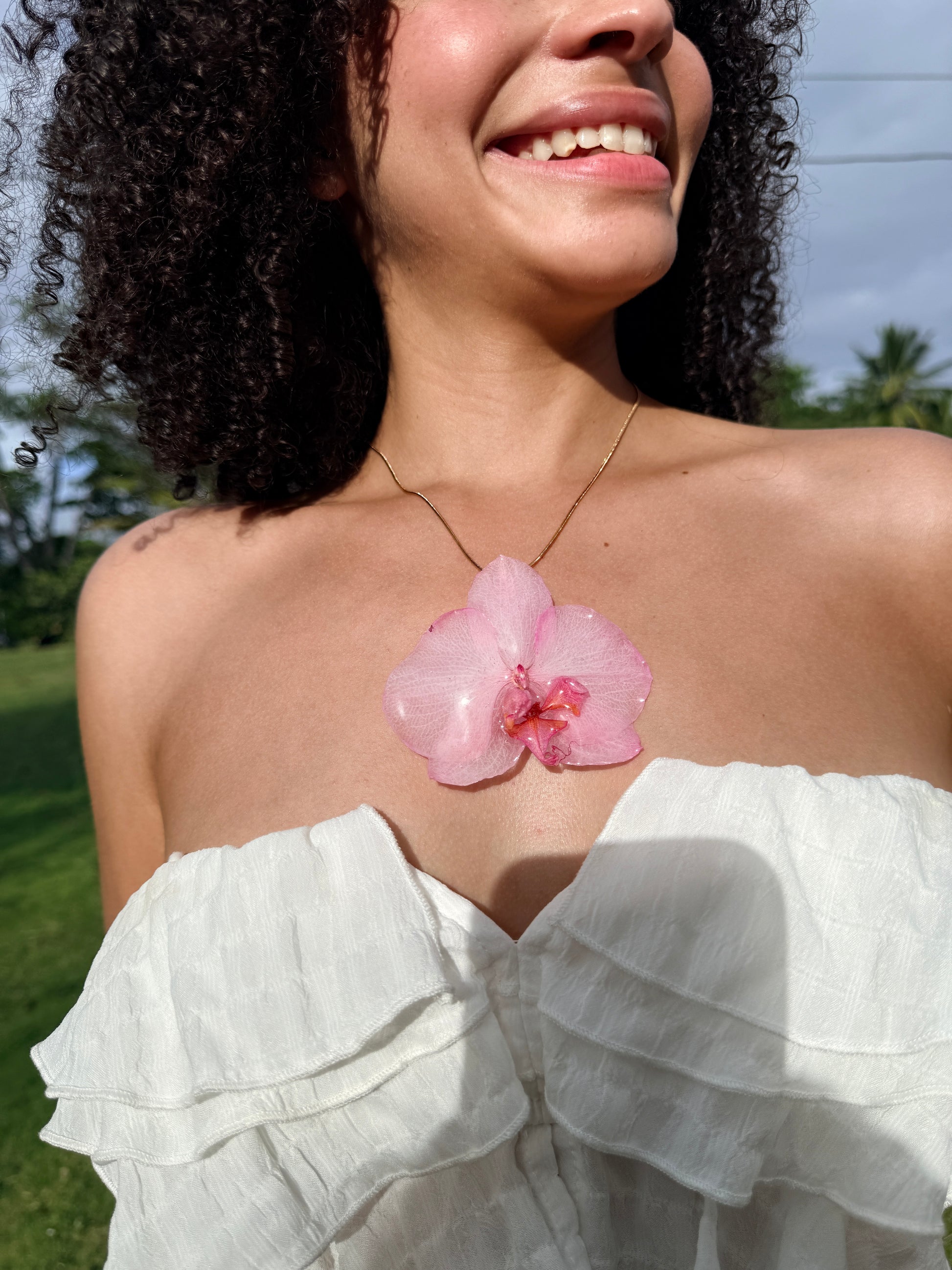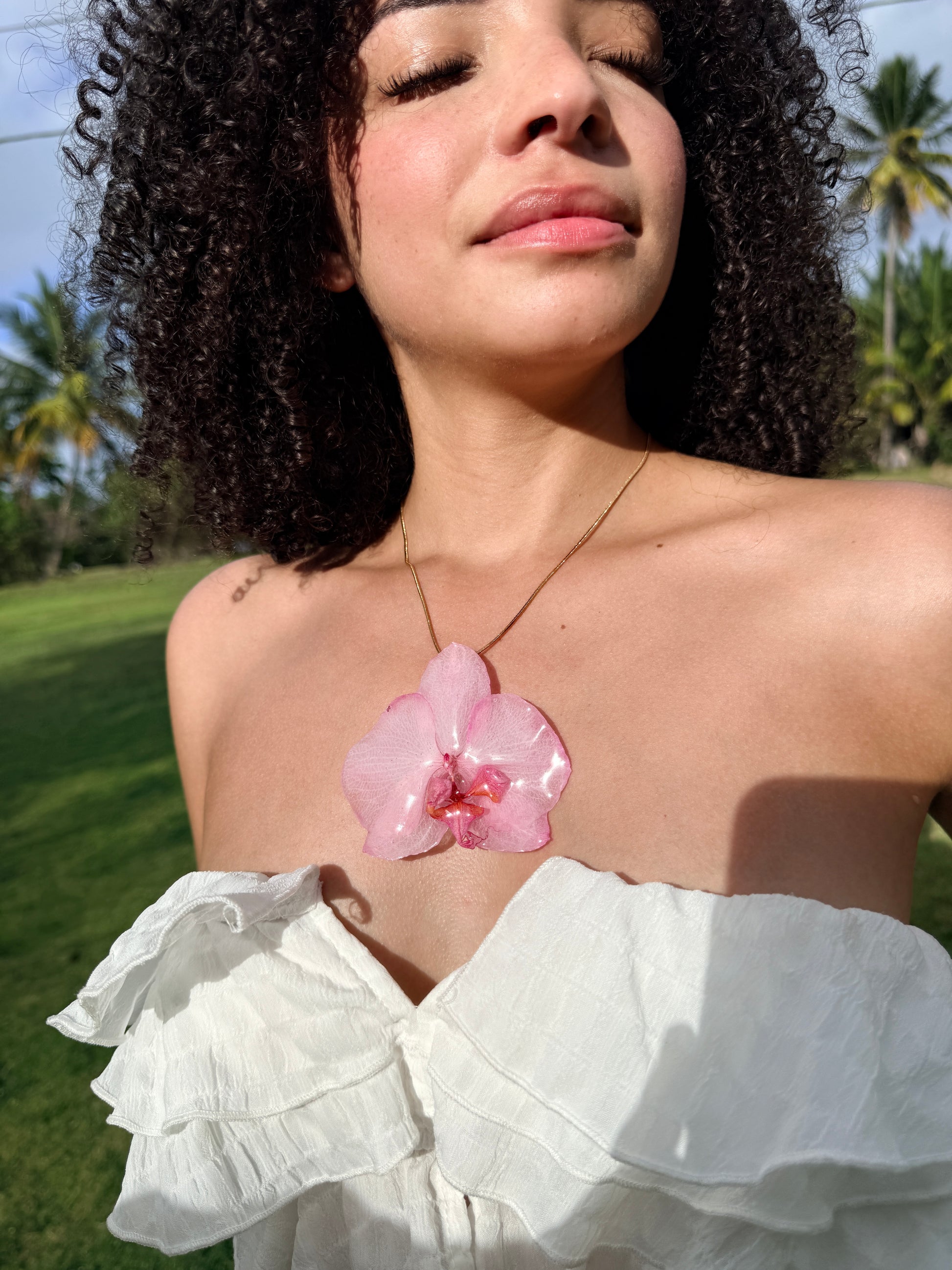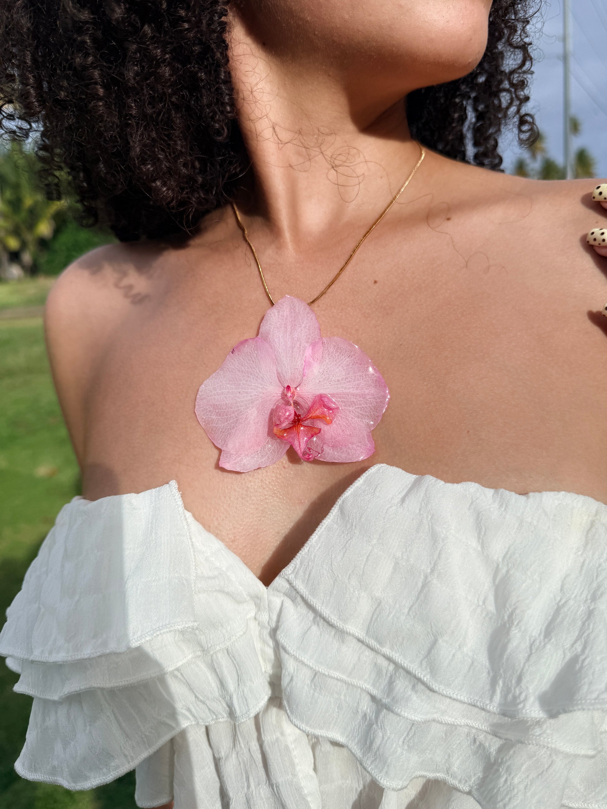 Este delicado collar presenta una orquídea natural en tonos rosados, preservada cuidadosamente en resina para conservar su belleza de forma eterna. Una pieza que transmite amor, suavidad y ese vínculo especial que solo mamá sabe crear.
