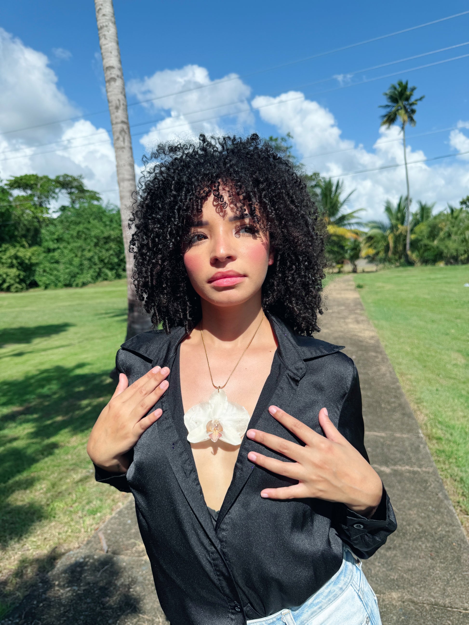 Este collar está elaborado con una orquídea Phalaenopsis natural, cuidadosamente preservada para mantener su forma, textura y color original.