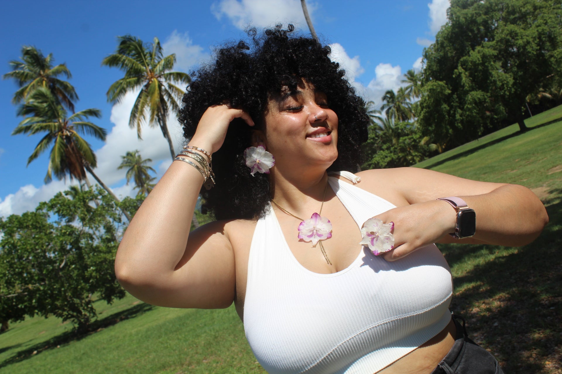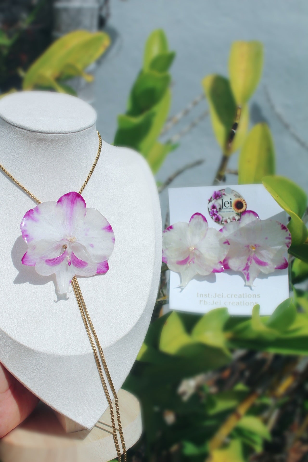 - Aretes de orquídea natural a juego, ligeros y cómodos, ideales para destacar en cualquier ocasión.
