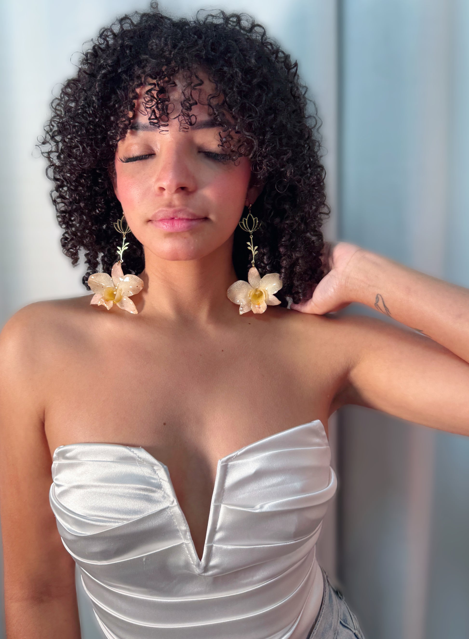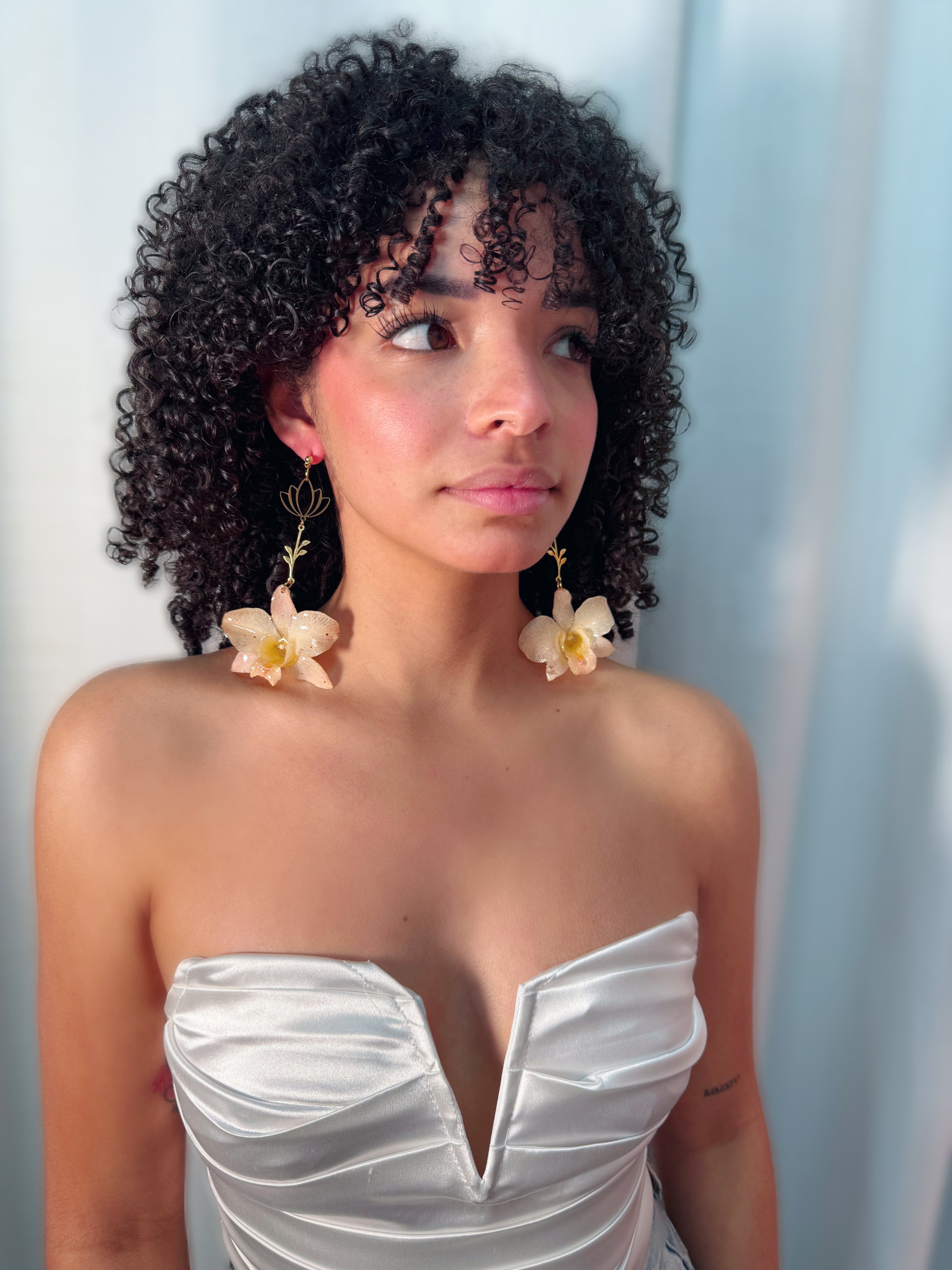 Estos aretes están elaborados con orquídea Dendrobium natural en tono melocotón, cuidadosamente preservada y sellada para conservar su delicadeza, textura y color original. Cada flor mantiene sus detalles naturales, lo que hace que cada par sea único e irrepetible.