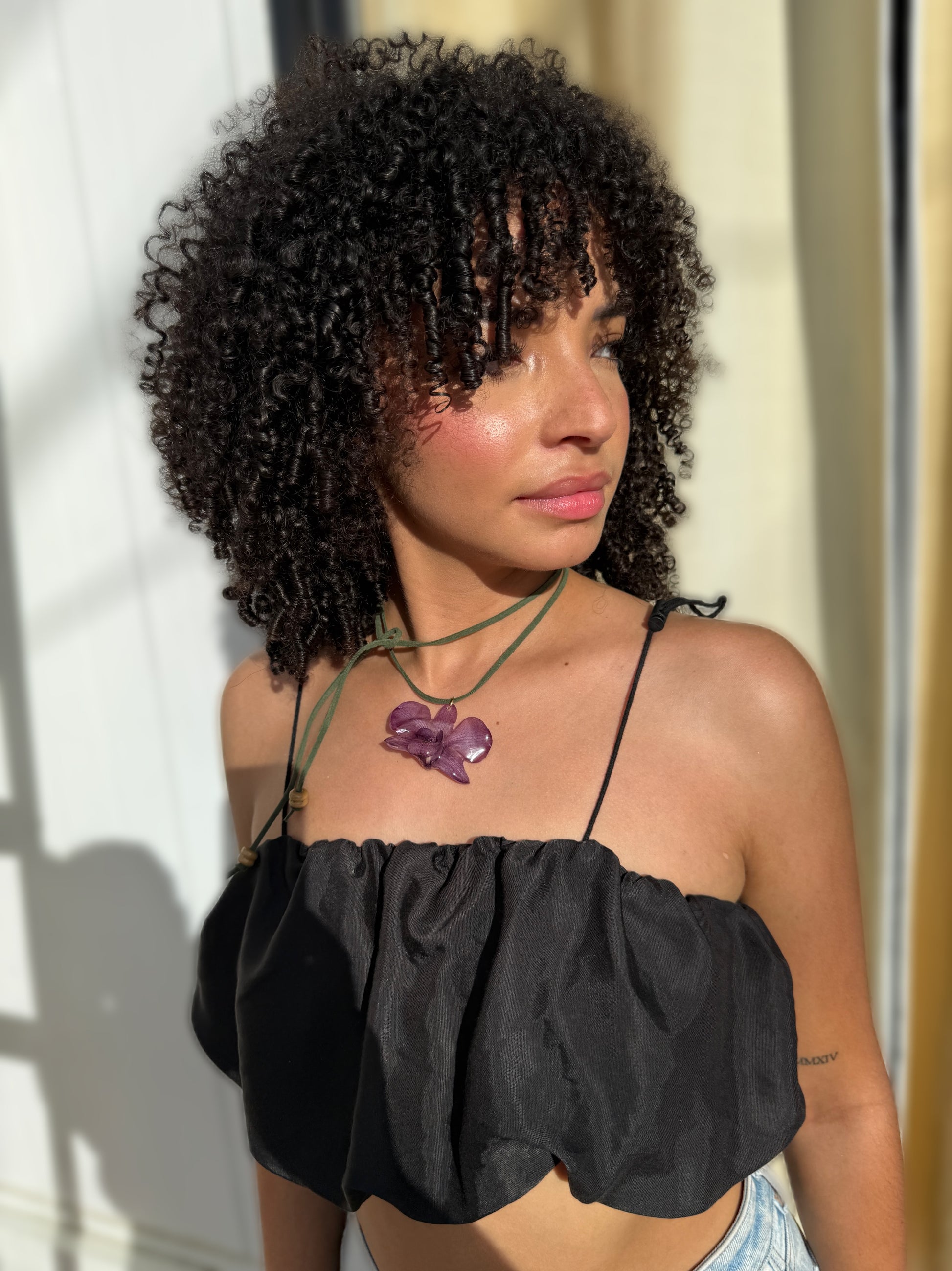 Este collar está elaborado con una orquídea Dendrobium natural, cuidadosamente preservada para conservar su forma, textura y color original.