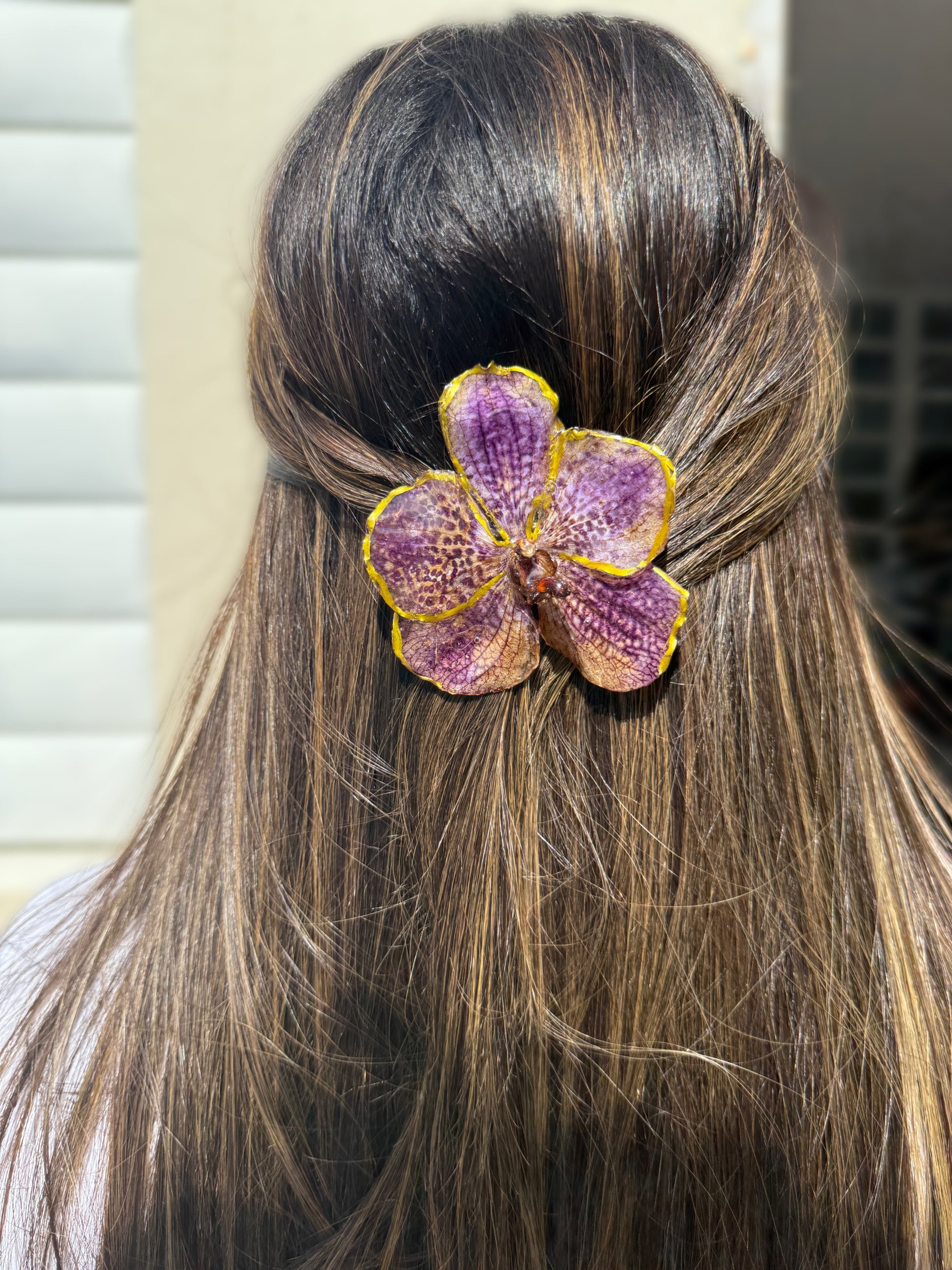Pinche de cabello elaborado con orquídea Vanda natural, cuidadosamente preservada y sellada para conservar su forma, textura y colores originales.