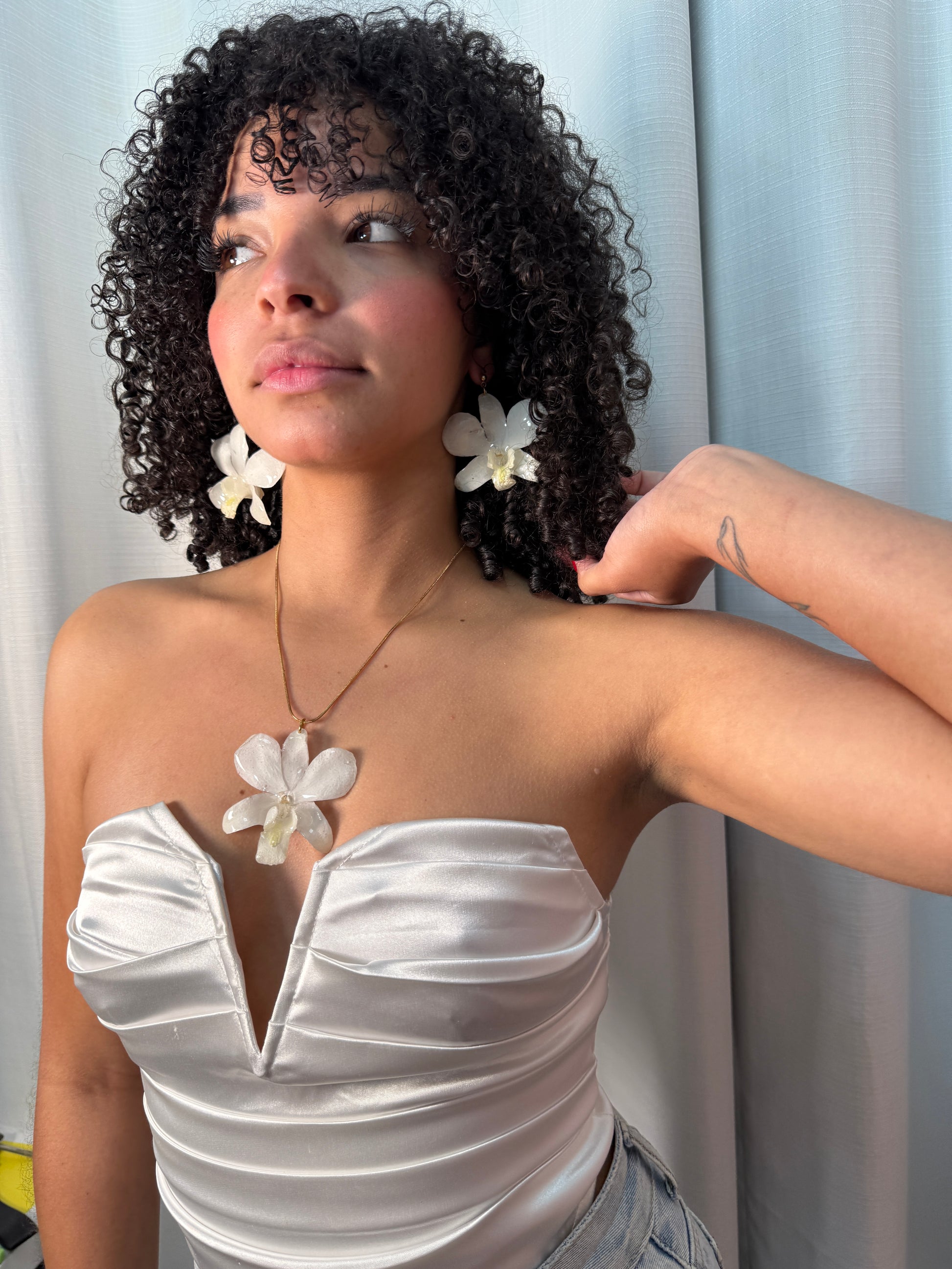 Este set está elaborado con orquídea Dendrobium blanca natural, cuidadosamente preservada y sellada para conservar su forma, textura y belleza original. Cada flor es trabajada a mano, respetando su estructura natural, lo que convierte cada pieza en un accesorio único e irrepetible.
